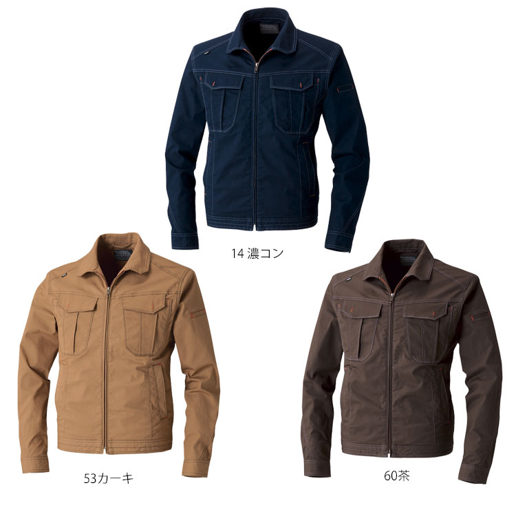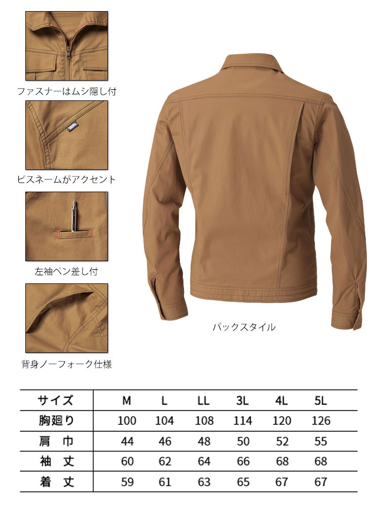素材:綿98%・ポリウレタン2%(ストレッチミニへリンボン) ・ファスナー部分はムシ隠し付き ・オリジナルボタン ・左袖ペン差し付き ・背身ノーフォーク仕様 ・アクティブに動けるストレッチ性素材 ・正装感とカジュアル感をミックスしたデザイン ・コストパフォーマンスにも配慮 ※大きいサイズ5L以上は割高になります。